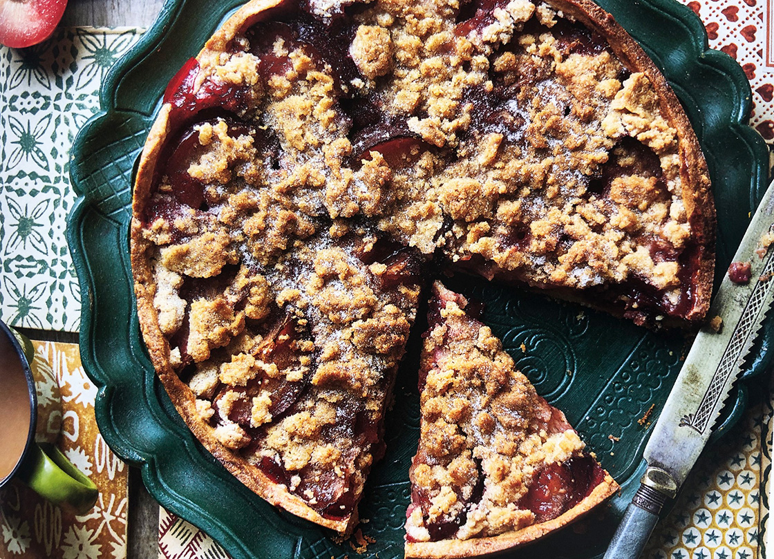 bilden. Die Klumpen über den Zwetschgen zerkrümeln.