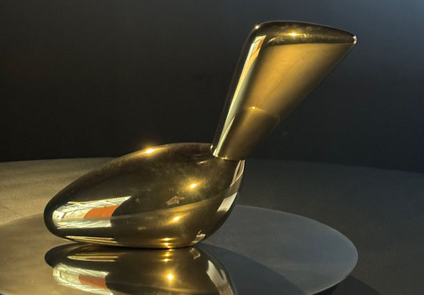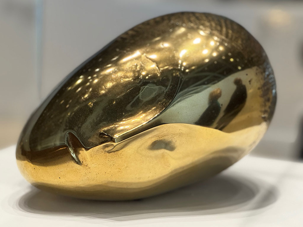 Brancusi entwickelte seine eigene, caharakteristische Handschrift, nachdem er kurze Zeit bei Rodin arbeitete. Die Reduktion auf das Wesentliche in seiner Formensprache wurden zu seinem Markenzeichen. Dazu polierte Veredlungen, so dass sich in den Objekten die Umgebung wiederspiegelte. „Leda“ (1926), polierte Bronze auf einem Sockel aus Neusilber, schwarzem Mamor und Granit präsentiert in einer besonderen, abegdunkelten Rotunde der Ausstellung, zeigt das deutlichst.
