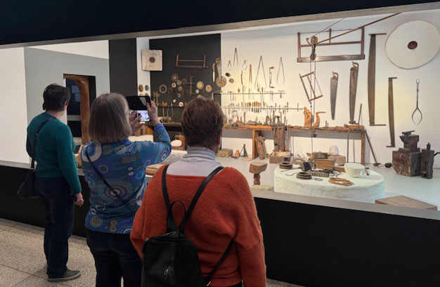 Ab den 1920er-Jahren präsentiert Brancusi seine Werke vorrangig in seinem Atelier in der Impasse Ronsin in Paris. Es ist für ihn nicht nur ein Ort der Arbeit, sondern gleichermaßen Ausstellungs- und Lebensraum. Als Herzstück der Retrospektive zeigt dieser Atelierraum Brancusis Werkzeuge, Möbel und Kunstwerke – ergänzt durch eine umfangreiche Auswahl an historischen Objekten, Dokumenten, Fotografien und Filmen, die gleich einer illustrierten Biografie von Arbeit und Leben des Ausnahmekünstlers