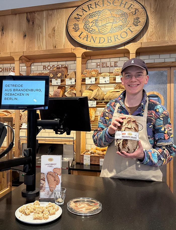 Antonius hilft professionell bei der Auswahl und betont: „Das bei uns verwendete Korn kommt von ökologisch bewirtschafteten Böden in Brandenburg. Und unsere Backwaren bieten wir mit den Schwerpunkten Vollkorn und Sauerteig an.“