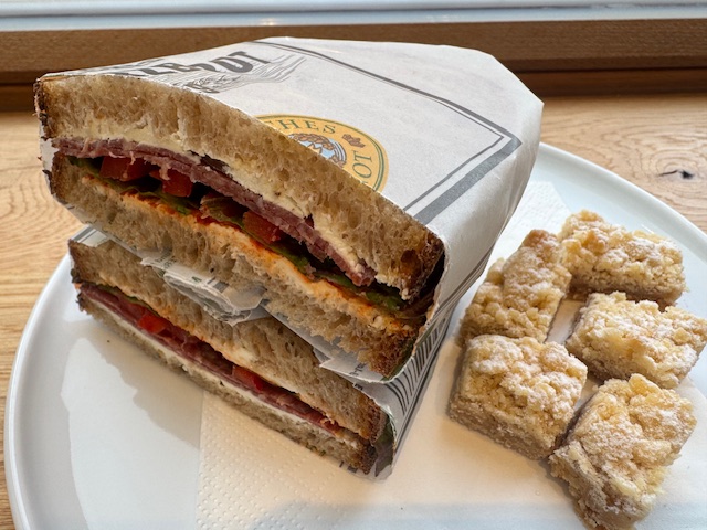 Sogleich vermittelt Antonius, der Verkäufer, ein Willkommensgefühl, wenn er sympathisch nach dem Einkaufswunsch fragt. Aber das ist ein Problem, denn hier ist die Auswahl durch das vielseitige Angebot schwer Jedenfalls für die, die hier das erste Mal einkaufen kommen. Kenner wissen genau, welches der rund 30 Brotsorten sie aus dem Sortiment ders Demeter Betriebes wünschen, welche Brötchen, Laugenbrezeln oder Croissants. Jedes einezelne Produkt an sich eine Verführung. Aber unwiderstehlich die frischen, leckeren Stullen mit Tofu, Käse oder Salami. Daran komme ich nicht vorbei.