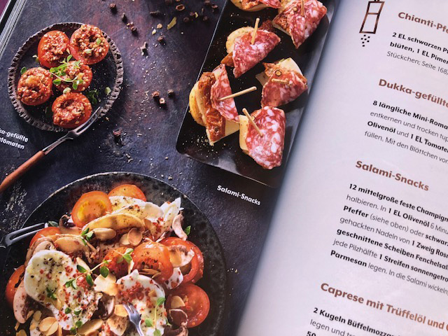 Und nun noch das kulinarisch Genüssliche, was auch beim Buchlesen passt (vorausgesetzt, die Buchseiten leiden nicht darunter). Jedes Mal ist es eine aufkommende Frage, wenn Freunde zum Plausch kommen und ein (oder auch mehrere) Gläser Wein gereicht werden, was passt als kleiner Snack oder größere Speise dazu? Das neue Buch „Zu jedem Wein die passende Leckerei“ von Bettina Matthaei und Dagmar Ehrlich kommt da gerade recht. Die Kochbuchautorin Matthaei entwickelt ausgefallenen Gewürzmischungen auch für prominente Köche, die studierte Önologin Ehrlich publiziert in Magazinen und Büchern über die Themen Wein und Genuss. Eine gute Voraussetzung für ein Buch, das sich auf Rebsorten abgestimmte Zutaten und Gewürze spezialisiert. Und das ist sehr gelungen.