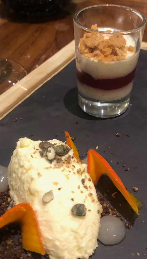Cheesecake Creme, Himbeere, Butterkekse, Basilikum und Weiße Schokolade, Hokkaido Kürbis, Tonkabohne, Ingwer